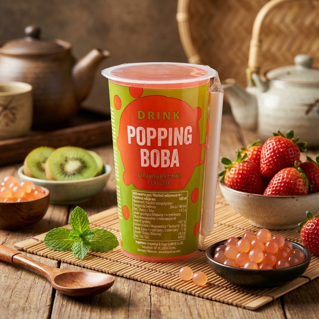 Erfrischendes Popping Boba Getränk aus Taiwan mit Erdbeere-Kiwi-Geschmack. Mit platzenden Boba-Perlen für ein einzigartiges Trinkerlebnis. 425ml Dose.