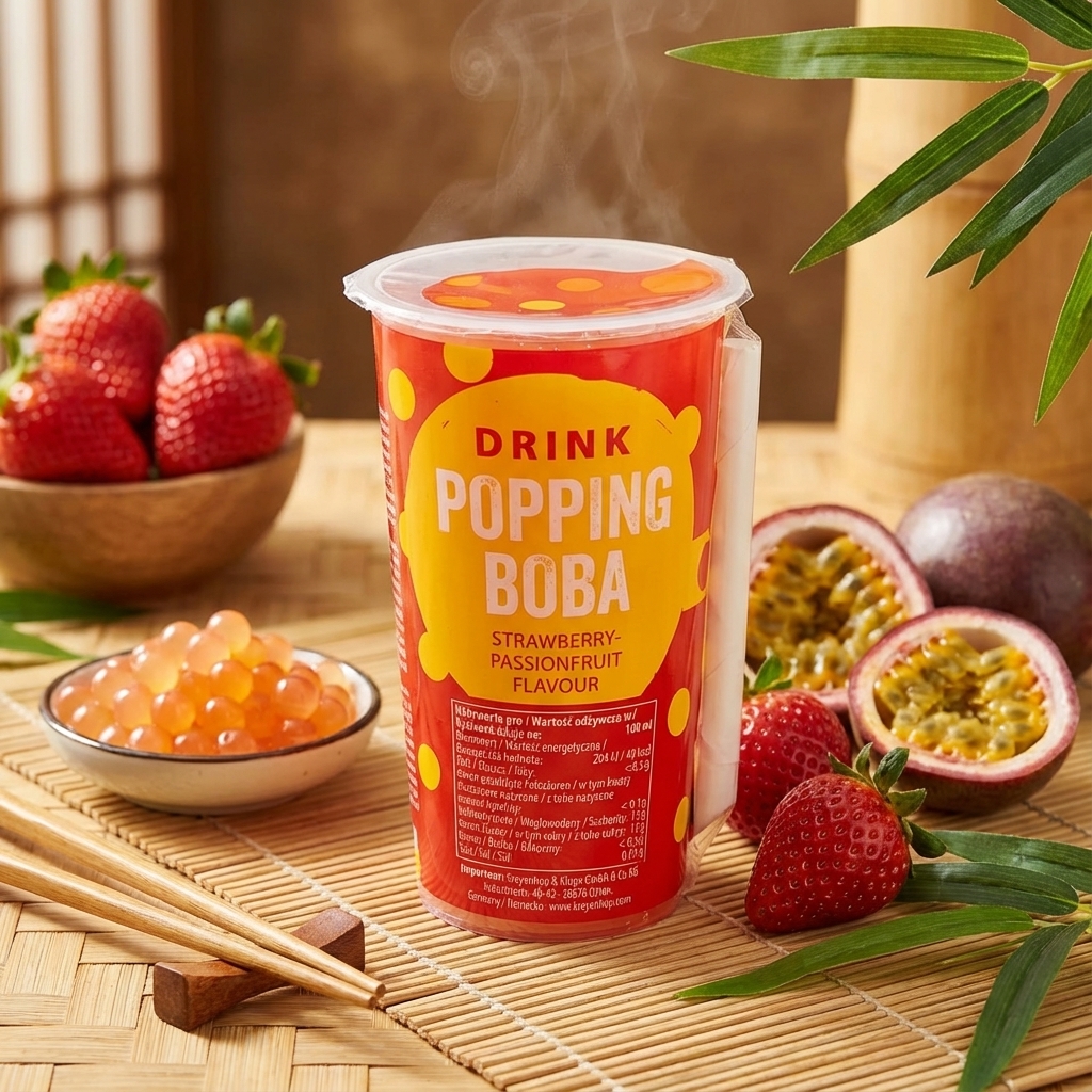 Entdecke das einzigartige Trinkerlebnis mit OBOBA Popping Boba – dem erfrischenden Getränk mit platzenden Boba-Perlen! Diese köstliche Kreation aus Taiwan vereint den süßen Geschmack von saftigen Erdbeeren mit der exotischen Intensität von Maracuja.