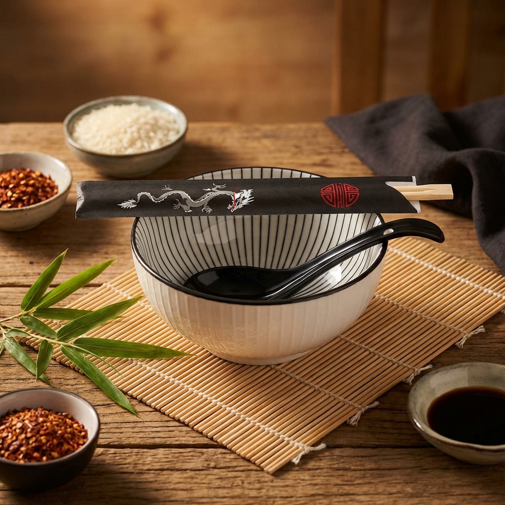 Das Set wird komplett mit einem schwarzen Suppenlöffel und einem Paar Holzstäbchen geliefert – alles, was du für den perfekten Ramen-Genuss brauchst. Die Essstäbchen kommen in einer stilvollen schwarzen Verpackung mit traditionellem Drachenmotiv und rotem Glückssymbol. Ob für dampfende Tonkotsu-Ramen, würzige Miso-Suppe oder eine erfrischende Pho – diese Schale macht jede Mahlzeit zu einem besonderen Erlebnis.